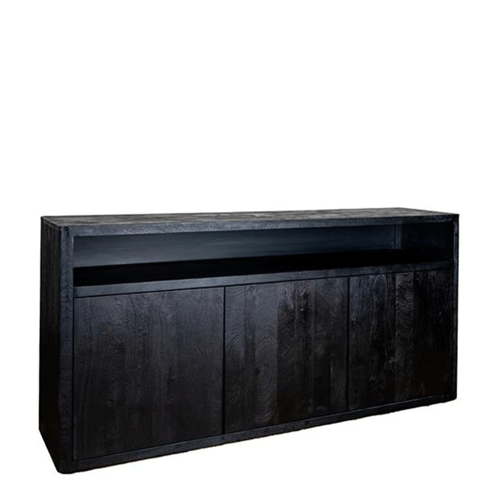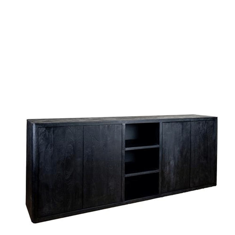 Black beauty opbergkast met 4 deuren en 2 open vakken. Deze collectie is gemaakt van volledig licht geborsteld massief mango hout. Door zijn eenvoud altijd makkelijk te combineren. De hoeken zijn afgerond en zorgen ervoor dat de Tenna kasten helemaal in de stijl van nu passen. De deuren hebben een push-to-open systeem, dus een greep is niet nodig. De kasten zijn zo ontworpen dat ze geen poten hebben, maar een bijna onzichtbare plint met verstelbare vloerdoppen.